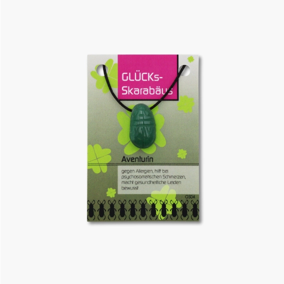 Der Skarabäus-Edelsteinanhänger aus Aventurin ist auf Band attraktiv auf einer detaillierten Beschreibungskarte in einer Zellophanverpackung drapiert. Die Größe einer Karte ist ca. 6 cm x 9 cm. Der Skarabäus ist circa 15 x 25mm groß.
