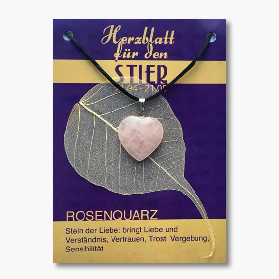 Herzblatt für den Stier – Rosenquarz Herz-Anhänger auf großer Karte